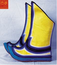 一般藏族男女通行的長筒靴,底高2厘米,腰高至小腿之上,用鞋帶系幫。從大的方面講,藏鞋可分為四種,即“松巴拉姆”、“嘎洛”鞋、靴子和“嘉慶”等,還有單層底、多層底等不同的鞋種,用氌氆、毛呢、皮革、氈子、綢緞、麻布等做料子?!八砂屠贰庇址Q松巴鞋,根據(jù)不同的地區(qū),松巴鞋還可分為藏松巴、江孜松巴、拉薩松巴等, 以花紋秀麗繁雜著稱。嘎洛鞋的特點是美觀、結(jié)實,分為兩種:工布地區(qū)的嘎洛,鞋腰多為牛皮底,上面勾出狗鼻紋;在墨竹工卡、彭波等地流行的嘎洛鞋則一般不用皮料作底,鞋面圖案大方、素雅。靴子大致也有三種:用黑色平絨布和牛皮相間作腰的稱為“熱瑪魯”;用絨布作筒的稱作“布江”;鞋腰全部用皮料的叫做“過瓦靴子”。靴子的顏色以黑色居多,具有典型的蒙古風格。而“嘉慶”是藏鞋中的高檔品,藏語里是“虹影”的意思,鞋面及鞋腰上的兩組線條恰似美麗的彩虹,底子很厚,用優(yōu)質(zhì)毛氈疊加,保暖結(jié)實。目前售價在七百元以上的“嘉慶”鞋多為過去上層官員專用。