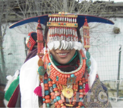 頭飾是普蘭飛天服飾的重要組成部分,一般由綠松石和珊瑚點(diǎn)綴,一個(gè)做成的飛天頭飾沒有幾萬元是買不下來的。當(dāng)然,那些鑲嵌其上的寶石決定了其價(jià)格的高低。普蘭市場中有一些尼泊爾商人專門制作那種頭飾,然后靜等當(dāng)?shù)厝罕妬磉x購。