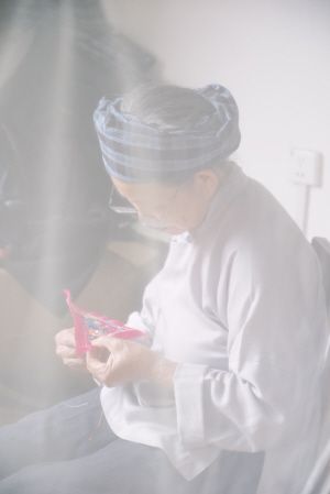 后來,我好幾天都到黃奶奶家,希望她可以染布給我看,但似乎總是機(jī)緣不到。一天,在黃奶奶家午睡醒來,隔著蚊帳,看見她側(cè)對(duì)著我正在繡花,沉浸在一片溫柔的光暈里。那是黃奶奶的另一項(xiàng)手藝,繡有龍鳳、獅子、蝴蝶、花朵、螃蟹這些吉祥花紋的繡片,會(huì)用在小孩背帶上,保佑他們健康長大。家里每個(gè)出生的成員都受到美和愛的環(huán)繞。