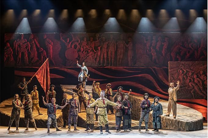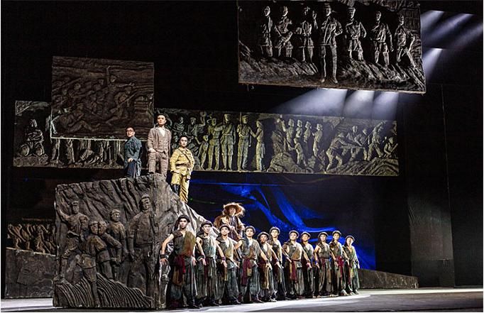 在舞蹈語言的設(shè)計(jì)上,編導(dǎo)融入當(dāng)代元素,使觀眾不但感受到審美的親切與現(xiàn)代感,而且還自然地進(jìn)入回望歷史的情境,對其思想內(nèi)涵的理解更為準(zhǔn)確。該劇的道具使用和調(diào)度也頗為大氣,令人印象深刻。一組斜坡狀的大型舞臺道具不但由群眾演員直接移動而實(shí)現(xiàn)即時(shí)的場景調(diào)度,還可使演員上下和左右而行,最終組合成巨大的中國共產(chǎn)黨黨徽,輔助完成了人民英靈和英雄的形象塑造。