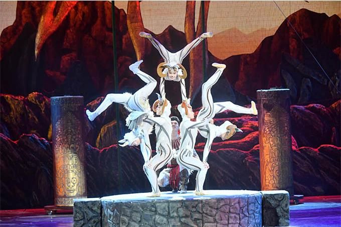 《巖石上的太陽》挖掘寧夏本土文化素材,以聞名于世的賀蘭山巖畫為創(chuàng)作主題,將非物質文化遺產(chǎn)用雜技藝術的形式再現(xiàn)出來,填補了寧夏歷史上大型原創(chuàng)雜技劇的空白。
