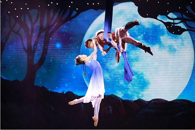雜技藝術在劇場空間維度的呈現(xiàn),一是把身體作為一種最為本質的符號材料進行直接表現(xiàn);二是通過與物體、音樂、舞蹈、燈光、唱詩等的排列組合,展示技藝的身體與物體、空間的關系,達到彰顯其生命意蘊與美學品質的目的。劇中網(wǎng)吊、綢吊、轉動桿上技巧等項目非常炫技,展現(xiàn)了現(xiàn)代雜技的審美意境,詩與思在舞臺上相得益彰。綢吊極具浪漫色彩,承載著輪回與終極的生命哲理;智者的“唱詩”,凸顯了該劇的史詩特征,增加地域文化和遠古歷史的厚重感。