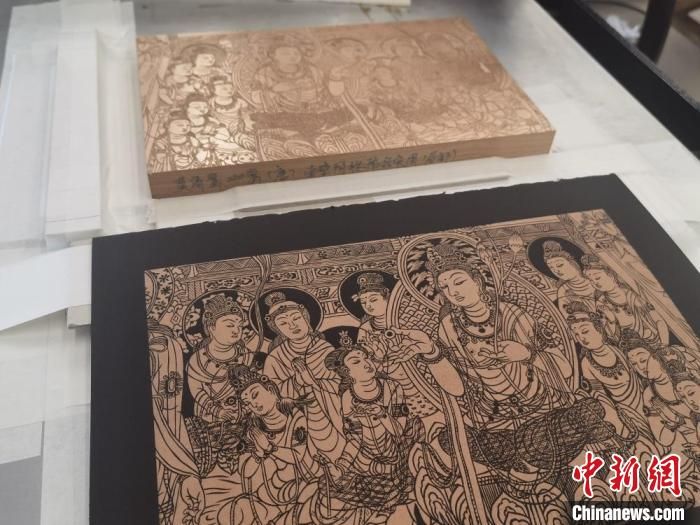 “將敦煌壁畫(huà)濃縮雕刻在木板上難度非常大,飛天裙裾要飄逸,菩薩的眉眼要有神,一刀都不能雕錯(cuò)?!毙鞎x林最近剛完成以莫高窟444窟和57窟的壁畫(huà)為原型的雕版畫(huà),目前累計(jì)完成上百件敦煌題材的雕版畫(huà)。