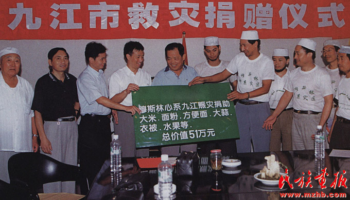 1998年,長江發(fā)生了全流域的特大洪水,災情牽動著全國各族人民的心,舉國掀起了“情系災區(qū)、奉獻愛心”的賑災熱潮。圖為回族企業(yè)代表在江西省九江市政府舉行捐贈儀式?!睹褡瀹媹蟆?998年第12期