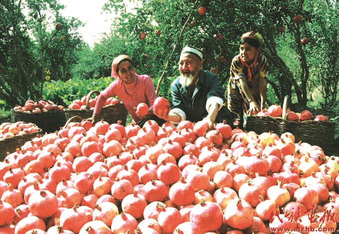興邊富民行動是1999年中央民族工作會議部署的一項重要的邊境建設工程,旨在“富民、興邊、強國、睦鄰”。興邊富民行動為新疆的發(fā)展帶來了實惠,2006年,看著豐收的石榴,維吾爾族農(nóng)民樂開了花?!睹褡瀹媹蟆?007年7期