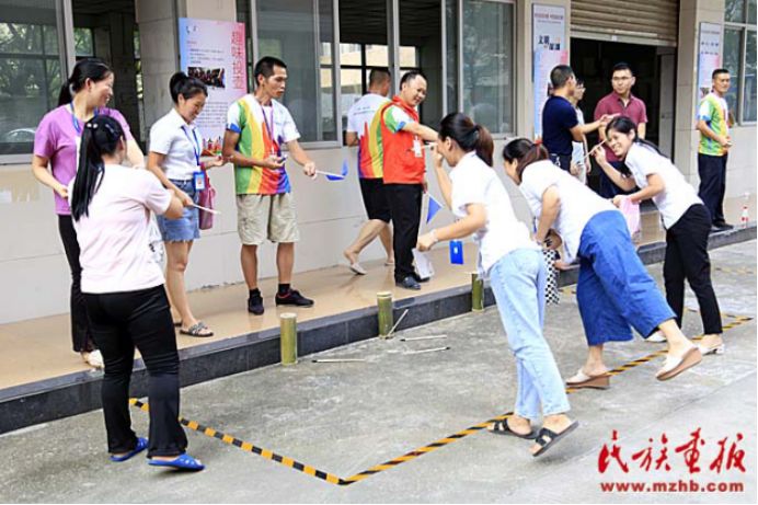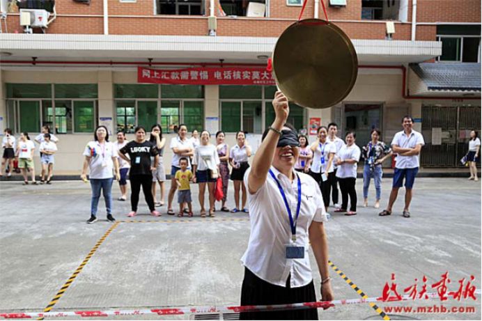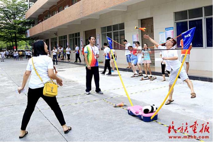 趣味運動會結(jié)合民族地區(qū)開展的傳統(tǒng)體育項目,以及趣味競技游戲等,展示了少數(shù)民族傳統(tǒng)體育特色,如盲敲銅鑼和高蹺便是利用了民族地區(qū)的一些傳統(tǒng)活動改編而來的,另外還有團隊協(xié)作的民族民間運動項目手毽、拔河和板鞋競速等。200余名各族群眾參加了這些帶有濃厚民族特色的運動項目。