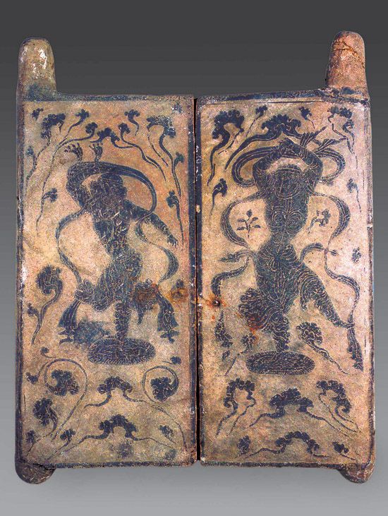 每扇門(mén)均呈長(zhǎng)方形,上下有圓柱狀榫,兩門(mén)閉合處各有一孔,出土?xí)r有鐵鎖鎖扣。每扇石門(mén)正中淺雕一“胡旋舞”男伎。所刻男伎為典型的胡人形象:虬髯卷發(fā),深目高鼻,寬肩細(xì)腰,體魄健壯。身著圓領(lǐng)緊身窄袖衫,下著緊腿裙,腳穿長(zhǎng)筒皮靴,站立在一塊編織精美的小圓毯上,雙人對(duì)舞。舞姿造型略有不同,左邊舞伎側(cè)身回首,左腳站立圓毯上,右腿后屈,左手正微微上舉,右臂屈至頭頂;右側(cè)男伎右腳立毯上,左腿前伸,雙臂上屈,至頭頂上方合攏。兩人均手舉長(zhǎng)巾,熟練揮旋。四周剔地淺浮雕卷云紋,似舞伎騰躍于云氣之中,造成流動(dòng)如飛的藝術(shù)效果。整個(gè)畫(huà)面構(gòu)思精妙,主題突出,人物面部表情生動(dòng)自然,體態(tài)輕盈健美,舞姿迅疾奔放、充滿歡樂(lè)生活氣息。