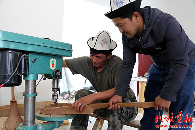 這間工作室的主人叫阿吉?jiǎng)e克·買買達(dá)洪,主人恰巧有事外出,他的弟弟,年輕朝氣的吾蘭別克張羅著給記者們當(dāng)起了翻譯。正忙活著打磨樂器的小伙叫木沙,今年31歲,問起庫姆孜的制作工藝,他才把頭抬起來,笑著說:“我做這個(gè)十年了。一把庫姆孜,往往琴身是杏木,蓋子是松木。杏樹、松樹木切割后放在干燥的地方,一兩年后才能用?!睅炷纷斡腥遥傧乙郧坝脛?dòng)物的腸子手工自制,現(xiàn)在有的工匠開始使用現(xiàn)成的弦。判斷庫姆孜手工藝人手藝高低的關(guān)鍵何在?木沙解釋說,“要看彈出來的聲音。木頭的原料不同,出來的聲音也不同。”這個(gè)回答似乎也隱藏了手工藝人的絕活所在,可意會不可言傳的技藝,往往在一代代的工匠手中以師徒親授的方式傳承。