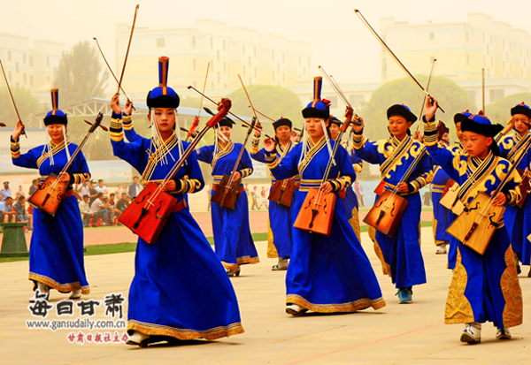 2016年8月底,肅北作為甘肅省唯一以蒙古族民族為主體的自治縣,特意承辦了八?。▍^(qū))第七屆“母語杯”蒙古文書法大賽作品展。在其頒獎晚會上,肅北縣烏蘭牧騎登臺亮相,博得一次次熱烈的掌聲。演出節(jié)目包括:歌曲《父親的故鄉(xiāng)》《陽光下的母親》《不會忘記》,舞蹈《筷子舞》《薩吾爾登》,馬頭琴齊奏《風中的蘇力德》等。
