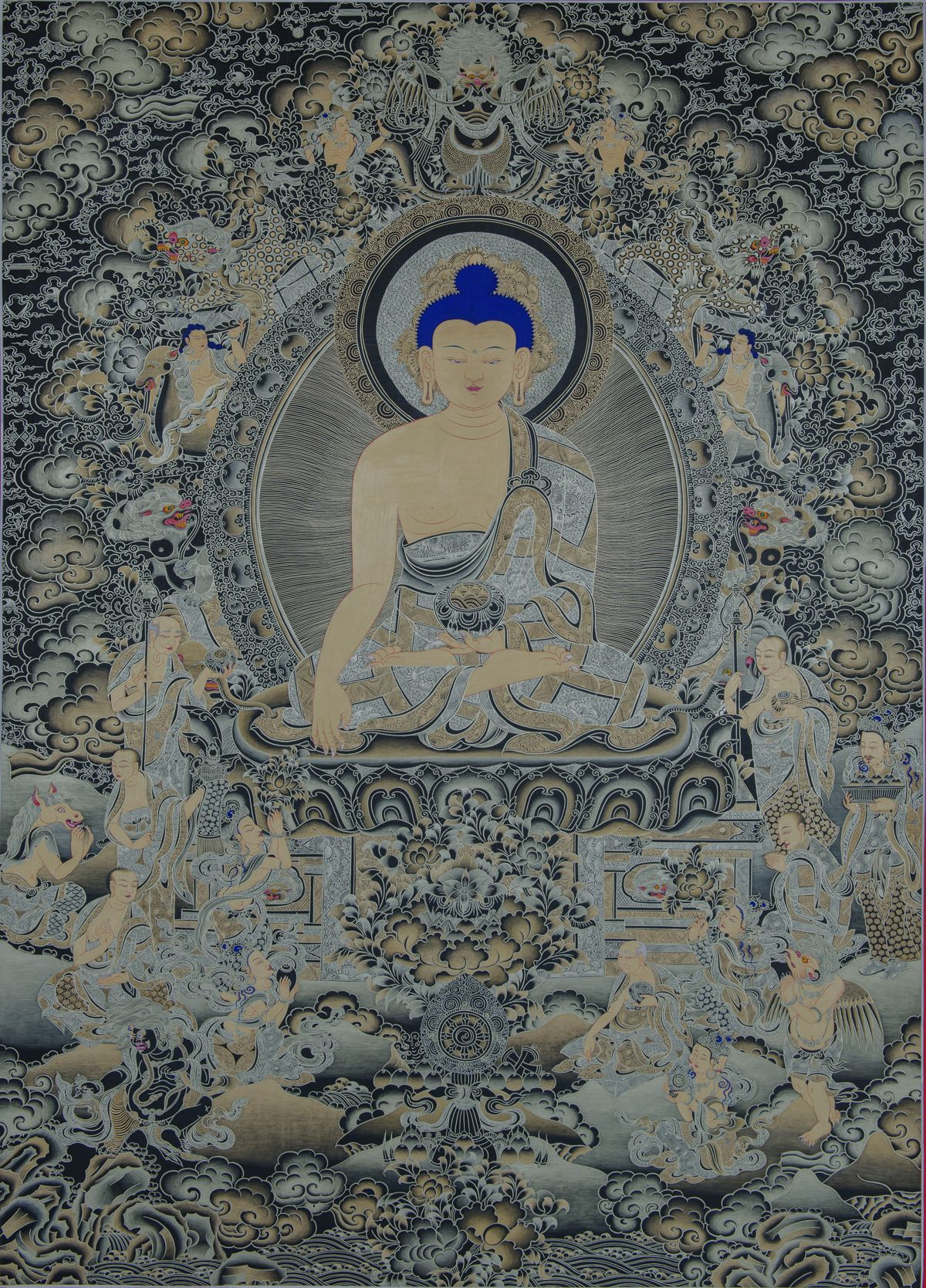 此唐卡是夏吾尖措畫家通過幾個月的辛勤勞作制成的又一大師級巨作。其制作工藝、顏料調配法都是夏吾家族幾代畫家傳承下來的絕世密法。原料也都是由祖先留下來的黃金用傳統(tǒng)秘方磨成水粉之后畫家用調好的黃金粉進行畫布上勾勒主尊釋迦牟尼佛祖,四周供奉為佛祖五大比丘,僑陳如、馬勝、婆沙波、大名、和跋提聽法灌頂。左右供奉為兩大梵天菩薩、國王、大上師等在傳授佛祖的初轉法輪場景,大護法在蓮花寶座下庇護惡魔降妖,背景用花鳥、山水、祥云等線條來襯托整個畫面的層次與審美。