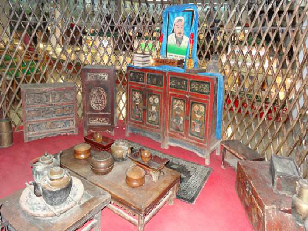 亞洲游牧、游獵民族創(chuàng)造的移動(dòng)式民居,在其發(fā)展過程中形成了兩大流派:一種是中國(guó)鄂倫春人的傳統(tǒng)建筑歇仁柱式(在鄂倫春語里歇仁柱為“木桿屋”之意),即尖頂、用獸皮或樹皮、草葉子做苫蓋。另一種是蒙古包式的,即穹頂圓壁,主要用毛氈做其覆蓋物。蒙古包的包門開向東南,既可避開西伯利亞的強(qiáng)冷空氣,也沿襲著以日出方向?yàn)榧榈墓爬蟼鹘y(tǒng)。而帳內(nèi)的中央部位,安放著高約二尺的火爐。火爐的東側(cè)放著堆放炊具的碗櫥,火爐上方的帳頂開有一個(gè)天窗?;馉t西邊鋪著地氈,地氈上擺放矮腿的雕花木桌。包門的兩側(cè)懸掛著牧人的馬鞭、弓箭、獵槍以及嚼轡之類的用具。帳內(nèi)的西側(cè)擺放著紅漆彩繪木柜,木柜的北角上敬放著佛龕和佛像,佛像前供放著香爐及祭品。