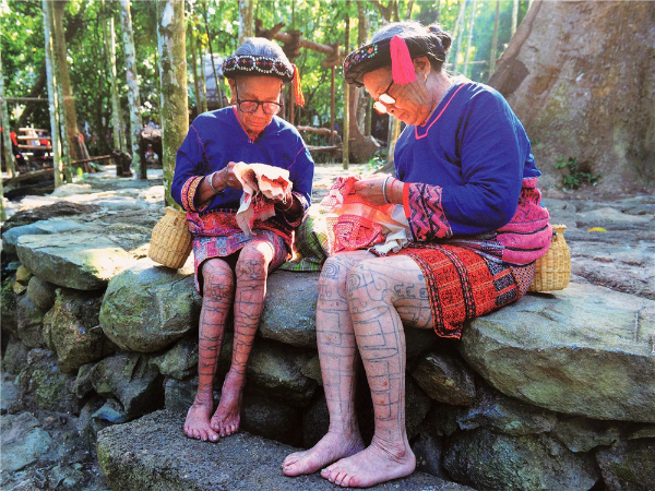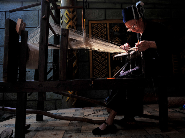 “織”是指使用踞腰織機(jī),采用通經(jīng)斷緯的紡織方法織出各種花紋圖案,在織布時,先手工掛經(jīng),綁住藤或樹皮布腰帶,用腳踩織機(jī)的經(jīng)線木棍,席地而坐織布??椈ㄊ怯煤谏蛩{(lán)黑色做底線(經(jīng)線),根據(jù)圖案需要,將各種染色的線搭配,拉經(jīng)線、投緯線(彩色線),用木刀打緊緯線,織出各種花紋圖案。