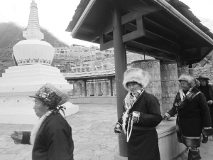 甘堡藏寨的村民們?cè)谵D(zhuǎn)經(jīng),他們的身后是“修舊如舊”的藏式民居
