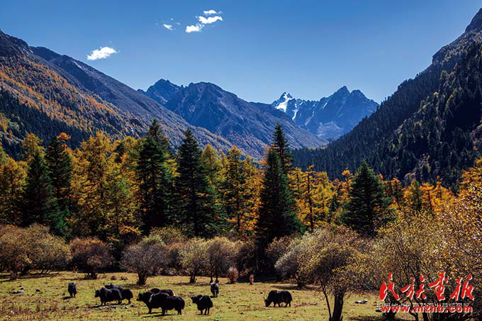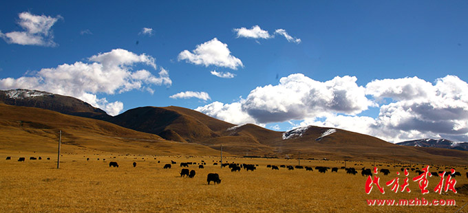 甘孜州的藍(lán)天白云、安詳牧群,金黃色西洋油畫般的美景吸引著八方游人(民族畫報(bào)社 列來拉杜攝影)