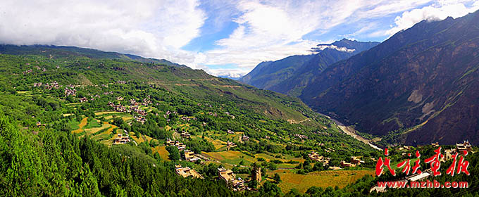 甘孜州東部的丹巴山寨體現(xiàn)了天人合一的理念,遠(yuǎn)遠(yuǎn)看去,充滿靈氣的山谷中,翡翠般的青草綠樹之中,是那沉甸甸的田地和隱在密林深處的寨房,伴著時(shí)有時(shí)無的潺潺溪流,一幅富有動(dòng)感的絕妙山寨畫卷隨之展示在你的眼前(民族畫報(bào)資料)