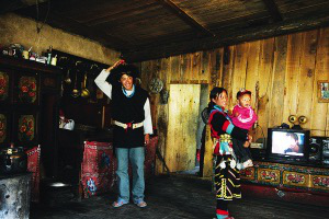 在珞巴族家中,男主外,女主內(nèi),分工相當(dāng)明確。當(dāng)達(dá)瓦在家里和我聊天時,他的妻子群宗一直在忙碌著,忙著給我打酥油茶,忙著生火燒水、煮土豆,忙著照顧孩子。為了讓我能拍一張達(dá)瓦一家人穿珞巴族服裝的照片,大家費(fèi)了好大勁兒。他們從東家借來帽子,從西家找來褂子,也有從南家借來的飾品……終于,達(dá)瓦和群宗夫妻倆都穿戴上了本民族的服飾,我如愿以償?shù)亟o他們拍了一張全家福。