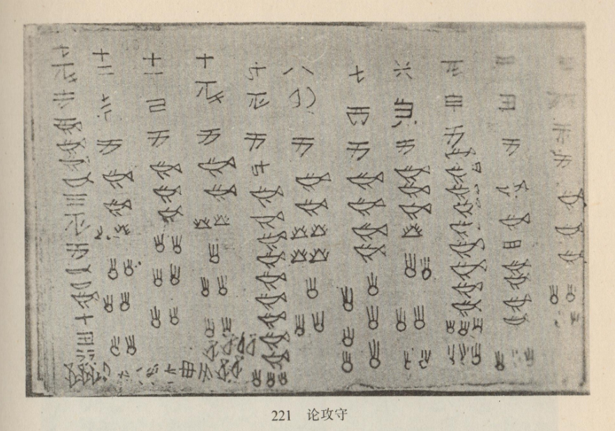 水書抄本。寫于清嘉慶年間,共20頁,長18厘米,寬27厘米。以竹簽作筆蘸墨書寫。內容述戰(zhàn)爭陣法。中圖魚形表示守方,方框為指揮位置,三角形表示山頭陣地,圓圈加三畫表示進攻之敵敗退形象。原件存北京圖書館。