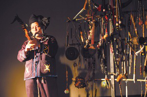 況且,《佤山古歌》并不是一場華麗的演出——演員的道具極其簡單,一些用木頭、動物毛等制成的樂器掛在一個木制的大架子上;演員的服裝并不艷麗,粗布制成的衣服、佤族一貫的“紅+黑”搭配。既然不在包裝上下功夫,也許有什么高科技看點,答案也是無,《佤山古歌》的設(shè)備只是一臺多媒體放映機,能播放事先拍攝的影碟而已。