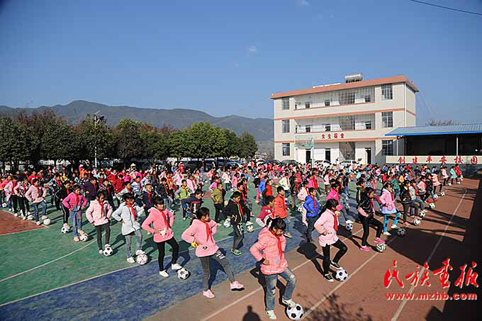 在新村聯(lián)排別墅的最南邊是中村鄉(xiāng)小學,這所學校是同傈園新村相依而伴建在一起的。上午十點,課間操的鈴聲打破了新村的寧靜。學生們歡快地沖出教室,每人手捧足球,來到操場。在老師統(tǒng)一的號令下,孩子們跳起了足球課間操。歡快的音樂旋律,伴著運球、帶球等不同的動作,孩子們的天真爛漫得到了充分詮釋。小學校長張世喜看著學生們歡樂的表情,高興的表情溢于言表。他說:“孩子們太幸福了?!?6年前,張世喜從楚雄師院畢業(yè)回到了家鄉(xiāng)的中村鄉(xiāng)峨山村委會小學,“場是土巴地,籃球架是用兩棵大樹做成的,教室里的桌椅高矮不一,找不到品相相同的兩張課桌,孩子們的宿舍是兩三個人擠一張床……”回憶起那時情景,張世喜記憶猶新。 “現(xiàn)在好了,住宿生縣財政每月每人都要補貼100元伙食費,孩子們頓頓有肉吃了,還為我們建起了兩棟宿舍樓,268名住宿生每人一張床,再也不用擠著睡了?!睆埵老舱f,在這樣的辦學條件下,我們工作越來越有激情了。