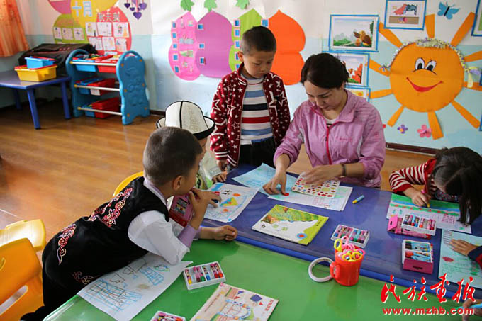古麗孜娜提帶領(lǐng)孩子一起繪畫(huà)