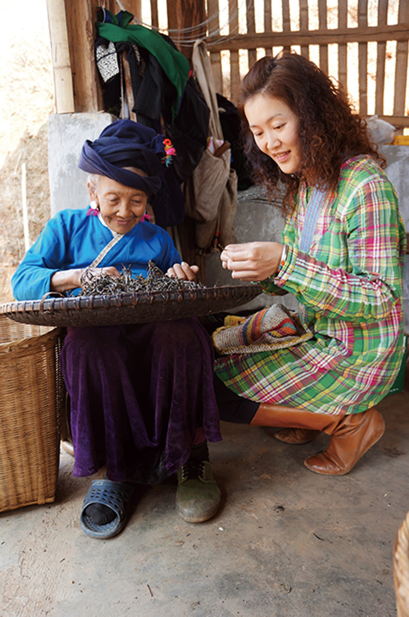 殺青完畢,接下來是手工揉捻。揉捻相較殺青要輕松得多,經(jīng)過處理的茶已開始轉(zhuǎn)化,散發(fā)出清新的香氣。此時萍芳終于可以坐下來,為自己和我們泡上新鮮的茶。