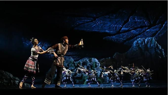 “花腰帶”既是精美的舞蹈道具,又是劇中人物情感的寄托,在整部舞劇中反復(fù)出現(xiàn)。特別是在雙人舞中,“花腰帶”將人物間無(wú)形的關(guān)系幻化成有形的聯(lián)系。劇中的蘆笙舞段,不僅僅是男女之間情愛(ài)的表達(dá),更突出表達(dá)了“開(kāi)山人”為了讓窮鄉(xiāng)告別貧苦,為大愛(ài)舍小愛(ài)、努力奮斗的決心,以及對(duì)美好生活的向往。傳統(tǒng)民族舞蹈在這部劇中被賦予了不同的含義。