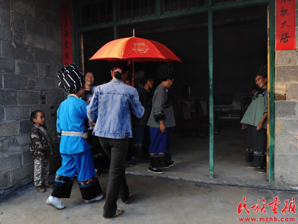 姑娘出嫁必須有娘家人陪送,婚禮這一天清早,“新娘”便在“接親客”的帶領(lǐng)和送親隊(duì)伍的陪同下,一路歡聲笑語 ,浩浩蕩蕩向“新郎”家走來。走到新郎家村邊,有的燃放鞭炮,一直燃放到新郎家門口,請新郎父母出來開門;無鞭炮準(zhǔn)備的,則在寨邊稍候,由迎親伙伴飛報(bào)新郎家做好迎親的準(zhǔn)備。男方父母聽到后,多數(shù)是很高興地喊醒家中兒女,由新郎的妹妹或堂姐妹為迎親主體,加上寨上的姐妹和房族組成迎親隊(duì)伍,打開大門,把新娘迎進(jìn)家來。接親的主要儀式是接傘。接傘的人必須是新郎的小妹或堂妹。無親妹、堂妹者則由新郎父母指定一與新郎同輩份的小姑娘去接。新娘走至大門,即由新郎的妹妹跨出門外迎接新嫂子,新嫂子接著用左手把雨傘遞給接傘的妹妹,接傘妹妹接過新嫂子手中的雨傘后,新娘即用左腳跨進(jìn)屋內(nèi),以示今后成為新家庭的主婦。隨即由接傘妹妹攜新娘手迎入新房,迎親婦女們陸續(xù)進(jìn)入新房休息。入門后,新郎家的“陪娘”及姑娘們便熱情地安排“送親客”團(tuán)團(tuán)圍坐,并簇?fù)碇靶履铩本o靠堂屋中柱子就坐,意為“新娘”從此當(dāng)家立業(yè),將來就像中柱子一樣,頂大梁,撐起這個家。