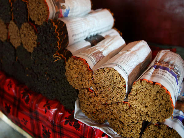 當?shù)厝私榻B說:制作藏香的原材料和制作工序要求極其苛刻。由于藏香最主要的用途是用在宗教禮儀上,所以在制作過程中要求一切都要以圣潔為主,否則會被視為是對神靈的不敬。傳統(tǒng)的藏香原材料繁多而復雜,一般是柏樹樹干為主料,再以藏紅花、麝香、白檀香、紅檀香、紫檀香、沉香、豆蔻、穿山甲、甘菘、冰片、沒藥等幾十種香料按適當比例配合主料搓揉而成。據(jù)了解,用于制作藏香的主料柏樹干,在吞巴村這樣高海拔的地方并不生長,從古至今,村民都要從400多公里外的林芝縣運過來了,而制作藏香的部分輔料甚至要從印度引進。