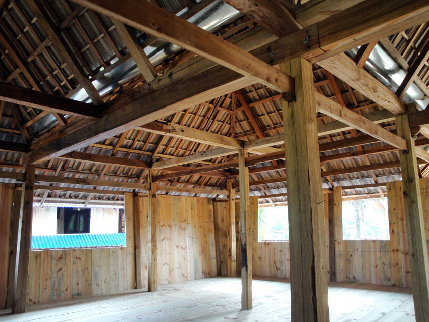 德宏瑞麗一帶的竹樓由“干欄”和平房兩部分組成,“干欄”是住房,平房是廚房?!案蓹凇倍酁殚L方形,下層架空,可堆放雜物。上層做橫向分割,成一間堂屋和數(shù)間臥室。堂屋中設(shè)有火塘,一般用于燒茶,在一角設(shè)有佛龕。堂屋外有開敞的前廊和曬臺。屋頂為歇山式,脊長,坡面平緩,外墻開窗,有的還是落地窗,墻與屋頂之間有縫隙,這些都加強了室內(nèi)空氣的流通,達(dá)到了室內(nèi)陰涼的效果。