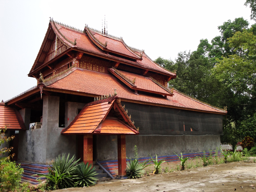 佛寺建筑是信仰小乘佛教的傣族地區(qū)建筑的一大特色,以落地重檐多坡面平瓦建筑為主。由大殿、僧舍和鼓房組成,中心佛寺外加一座戒堂、一座藏經(jīng)樓、一座佛塔。主殿外觀一般是單檐或重檐歇山式屋頂,或懸山式頂、多角或亞字形重檐歇山式頂。坡面進(jìn)行一至二次跌落后有兩層或上中下三層的單面坡或三面坡、五面坡,坡面的多少和佛寺的級別有關(guān)。屋面按縱向分為兩段式或三段式或五段式,以中間最高,使龐大威嚴(yán)的屋面呈現(xiàn)出優(yōu)美起伏的曲線。
