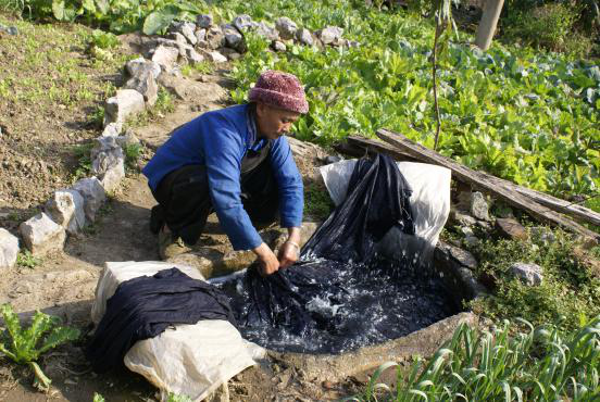 從前壯族鄉(xiāng)村,普遍掌握制作藍(lán)靛及印染方法。一般置一大缸,將藍(lán)草放入浸泡,加石灰使之分解、發(fā)酵,經(jīng)過(guò)化學(xué)變化,而后濾去殘?jiān)舭l(fā)水分,凝成糊狀藍(lán)色染料。其間需不斷攪動(dòng),使色素充分化解。“每靛草六百斤,造成一百斤之靛為佳?!币虍a(chǎn)量較多,遠(yuǎn)銷(xiāo)廣東。浸染時(shí),將適量靛糊化于染缸中,同時(shí)將雞血藤搗碎加入。布要反復(fù)浸泡多次,晾泡結(jié)合,直到染為深藍(lán)色。其間雞血藤釋放出一種紫紅色的植物膠,將藍(lán)靛色素粘在纖維上,是色素耐水耐腐耐紫外線,不易褪色,并有若隱若現(xiàn)的亮點(diǎn),結(jié)實(shí)美觀。這個(gè)過(guò)程,運(yùn)用了化學(xué)分解法。