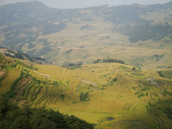 元陽(yáng)哈尼族開墾的梯田隨山勢(shì)地形變化,因地制宜,坡緩地大則開墾大田,坡陡地小則開墾小田,甚至溝邊坎下石隙也開田,因而梯田大者有數(shù)畝、小者僅有簸箕大,往往一坡就有成千上萬(wàn)畝。元陽(yáng)梯田規(guī)模宏大,氣勢(shì)磅礴,綿延整個(gè)紅河南岸的紅河、元陽(yáng)、綠春及金平等縣,僅元陽(yáng)縣境內(nèi)就有17萬(wàn)畝梯田,是紅河哈尼梯田的核心區(qū)。元陽(yáng)縣境內(nèi)全是崇山峻嶺,所有的梯田都修筑在山坡上,梯田坡度在15度至75度之間。以一座山坡而論,梯田最高級(jí)數(shù)達(dá)3000級(jí),這在中外梯田景觀中是罕見的。元陽(yáng)哈尼梯田主要有3大景區(qū):壩達(dá)景區(qū)包括箐口、全福莊、麻栗寨、主魯?shù)冗B片14000多畝的梯田;老虎嘴景區(qū)包括勐品、硐浦、阿勐控、保山寨等近6000畝梯田;多依樹景區(qū)包括多依樹、愛春、大瓦遮等連片上萬(wàn)畝梯田。如此眾多的梯田,在茫茫森林的掩映中,在漫漫云海的覆蓋下,構(gòu)成了神奇壯麗的景觀。這些景區(qū)就是目前準(zhǔn)備申報(bào)世界遺產(chǎn)的核心保護(hù)區(qū)。