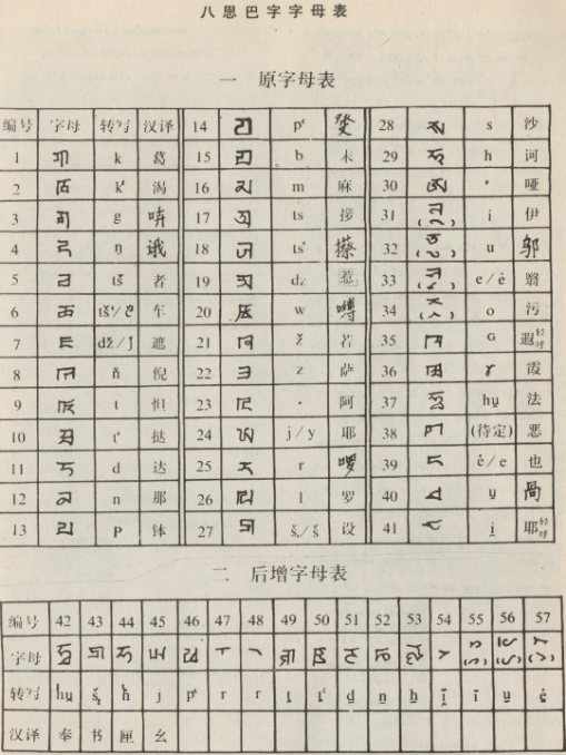 八思巴字字母分輔音字母和元音(含半元音)字母兩類。每一個(gè)字母原則上代表一個(gè)音素。