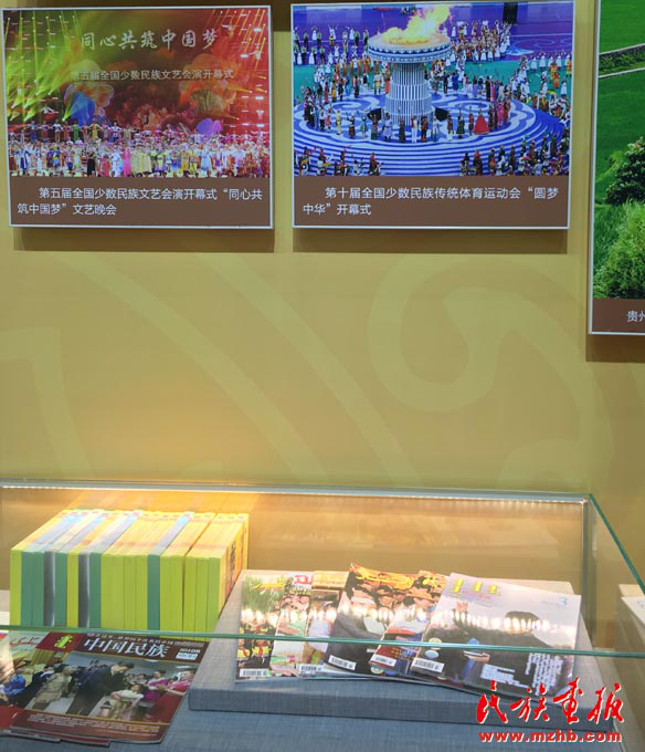 2017年,在“砥礪奮進(jìn)的五年”大型成就展上展出的《民族畫報》六種文版期刊以及《民族畫報》記者拍攝的反映民族工作成就的圖片