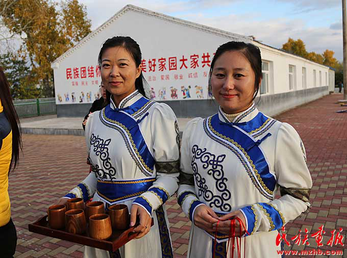 迎著夕陽,我們來到黑龍江省坤河達斡爾族滿族鄉(xiāng)坤河村,首先映入眼簾的是曲棍球球桿形狀的路燈、鐵柵欄,因達斡爾族酷愛曲棍球,所以這些設(shè)施都以曲棍球球桿的形狀打造,墻體噴涂圖案以及勒勒車都融入了達斡爾族文化符號,熱情的達斡爾人以奶茶款待賓朋。在這里我們以達斡爾族文化為指引去追尋達斡爾族南遷的足跡。