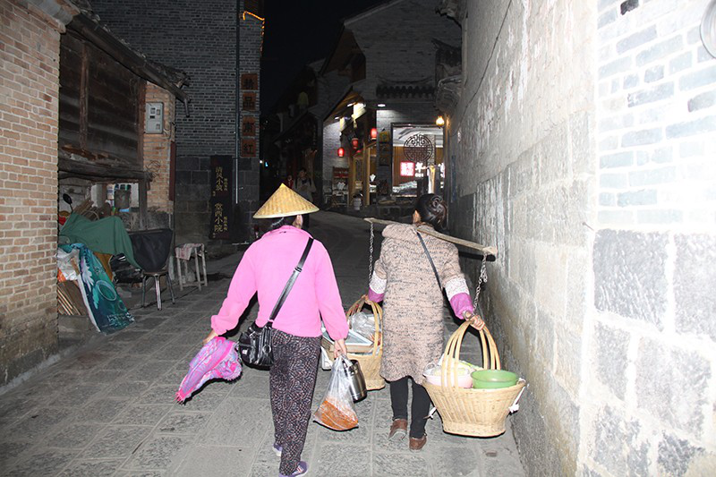晚上7點(diǎn)多鐘,一群在小河里撲騰了一天的鴨子排著隊(duì)憨態(tài)可掬地回到寸家灣巷口,忙碌一天的人們也開(kāi)始回家。我正擔(dān)心晚上約定的采訪找不到地方,卻在圖書館旁邊的小巷里碰到了收工回家的姜聰留。她今天的松花糕賣了一板半,收入100多元。同行的一個(gè)姐妹幫她挑著擔(dān)子,姜聰留自己提著袋子和板凳,一路無(wú)語(yǔ)。臨近家門的路口,姜聰留從姐妹肩上接過(guò)擔(dān)子,眼神默契相視后,各自回家——這就是她們的生活。晚飯姜聰留到丈夫的大哥家吃土鍋?zhàn)?,兩家的院子只隔一墻,我也跟著進(jìn)了大哥江宗良的家門。