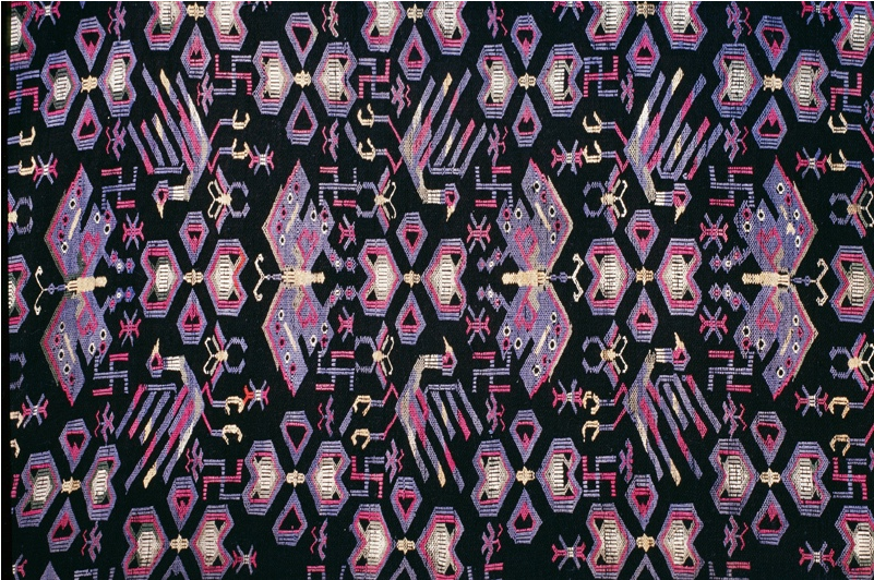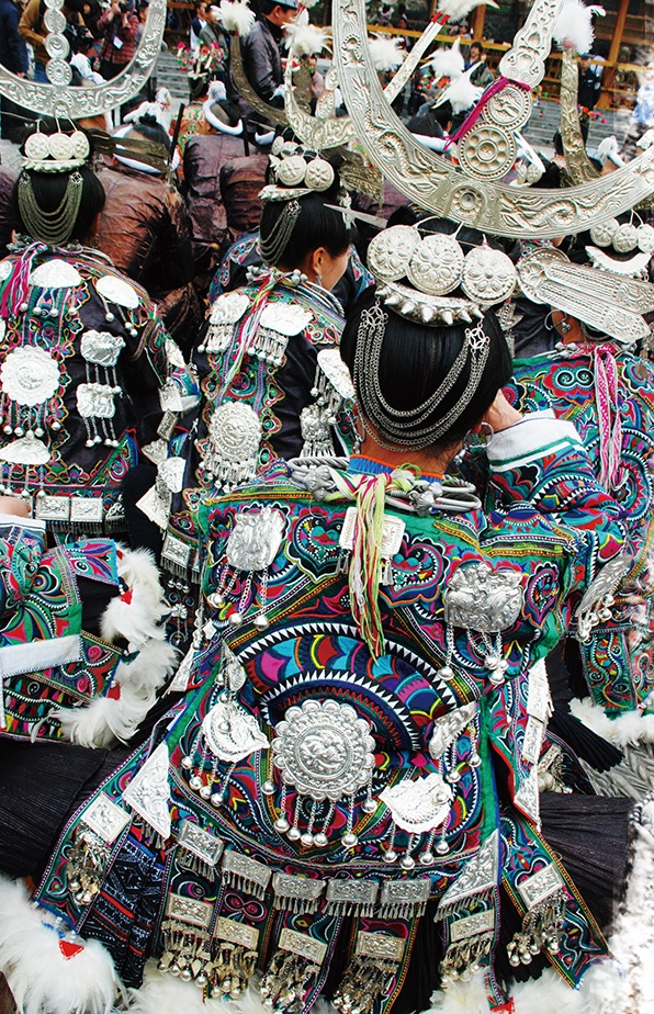 亳無疑問,蝴蝶圖騰即是對蠶的崇拜,蠶文化原初的核心便是人歸途的儀式,人要在這種和蠶一祥的儀式中得到再生。今天的苗族,仍然保持著以絲綢裹身而葬的喪葬習(xí)俗。我祖母養(yǎng)蠶織就的絲織品,我們習(xí)慣稱作蠶絲床單,絕大部分是備著喪葬所用。凡有人去世,主客必送一床蠶絲單,沒有是不行的,被視為不懂禮節(jié),而死者獲得蠶絲單越多越好。有的人家收到的蠶絲單過多,就會(huì)保存一部分,留著將來的喪事送禮。苗族每個(gè)人都必備一件絲質(zhì)壽衣。并且,在許多重大的儀式活動(dòng)中必須要著絲綢服裝。比如在苗族重大的鼓藏節(jié)期間,鼓社頭必須穿絲織鼓社服;大祭典活動(dòng)時(shí),祭師也必須穿絲質(zhì)服裝等等。