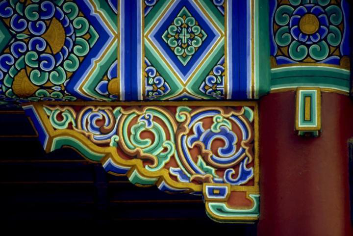 彩畫著色是一項關(guān)鍵的工序,不能有半點差錯。工匠們?yōu)椴煌伾O(shè)定了代號,一米色、二淡青、三香色、四硝紅、五粉紫、六洋綠、七佛青、八石黃、九紫色、十黑煙、十一紅等。將代號直接寫在地仗上,然后根據(jù)色號將各種色料對號入座,涂刷著色一、二遍,待干后再刷一遍光油罩光,以起保護作用。彩畫所用色料一般均為各色成品油漆。