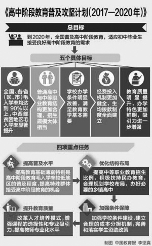 “高中教育是選擇性教育,僅僅提供學位,缺乏吸引力,學生不愿意上,普及目標就難以實現(xiàn)?!苯逃肯嚓P負責人解釋說,在確保普及程度的基礎上,要體現(xiàn)全面科學的普及觀,防止簡單追求數(shù)量和規(guī)模的增加。因此,除了2020年我國高中階段教育毛入學率將要達到90%這個總目標外,《攻堅計劃》還提出了5個具體目標: