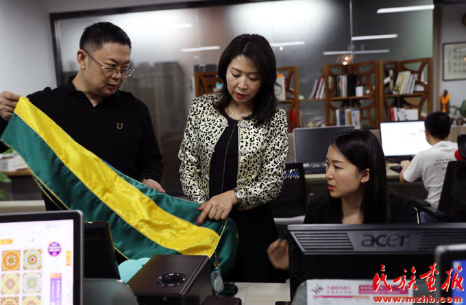 孔麗(中)是來自云南德宏的景頗族,她的公司致力于將少數(shù)民族優(yōu)秀文化與商業(yè)相結(jié)合,這是她在與公司員工商議產(chǎn)品設(shè)計(jì)方案(和勇 攝影)