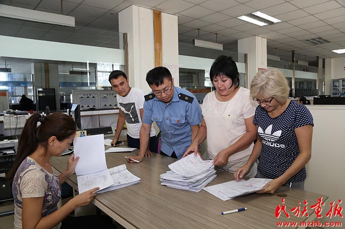 中哈兩國鐵路人員在阿拉山口口岸進(jìn)行貨物交接驗(yàn)收(滕俊 攝影)