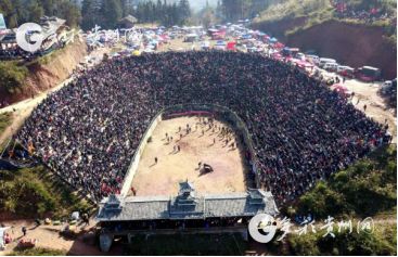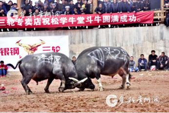 貴州省從江縣第十五屆原生態(tài)侗族大歌節(jié)的前一天,恰逢該縣逢亥斗牛日,丙妹鎮(zhèn)松學(xué)斗牛塘、谷坪鄉(xiāng)四寨河斗牛塘同時舉辦傳統(tǒng)牛王爭霸賽,喜迎一年一度“侗族大歌節(jié)”的到來,共有來自周邊村寨的80頭水牯牛參戰(zhàn),斗?;顒訄錾厦=侵穑瑘雒娈惒始姵?,吸引數(shù)萬名觀眾前來觀戰(zhàn)。