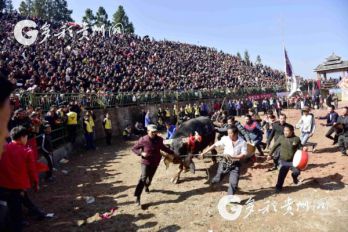 貴州省從江縣素有“風情斗牛之鄉(xiāng)”之美譽,斗牛文化歷史悠久,底蘊深厚,傳說早在三國時期孔明南征就已盛行逢亥斗牛的習俗,至今已有兩千多年的歷史。每年秋收結(jié)束開始至來年春耕前,當?shù)胤旰ト斩紝⑴e辦斗?;顒?。近年來,當?shù)攸h委、政府高度重視斗牛文化的保護和傳承工作,加強對民間斗?;顒拥囊龑?dǎo)和管理,成立了斗牛協(xié)會組織,制定了《從江縣規(guī)范民間斗?;顒拥臅盒幸?guī)定(試行)》,加大投入改善斗牛塘基礎(chǔ)設(shè)施,使民間斗牛活動逐漸走向程序化、規(guī)范化和科學(xué)化管理,讓民間斗牛文化得以傳承和發(fā)揚的同時,確保群眾生命財產(chǎn)安全,促進了民族團結(jié)和社會和諧。