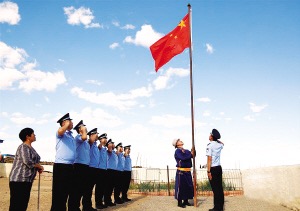 阿迪雅(右二)、妻子娜仁其其格(左一)與內(nèi)蒙古出入境邊防檢查總站包頭邊境管理支隊(duì)滿都拉邊境派出所民警在院子里升起國(guó)旗。 馮楚帆攝