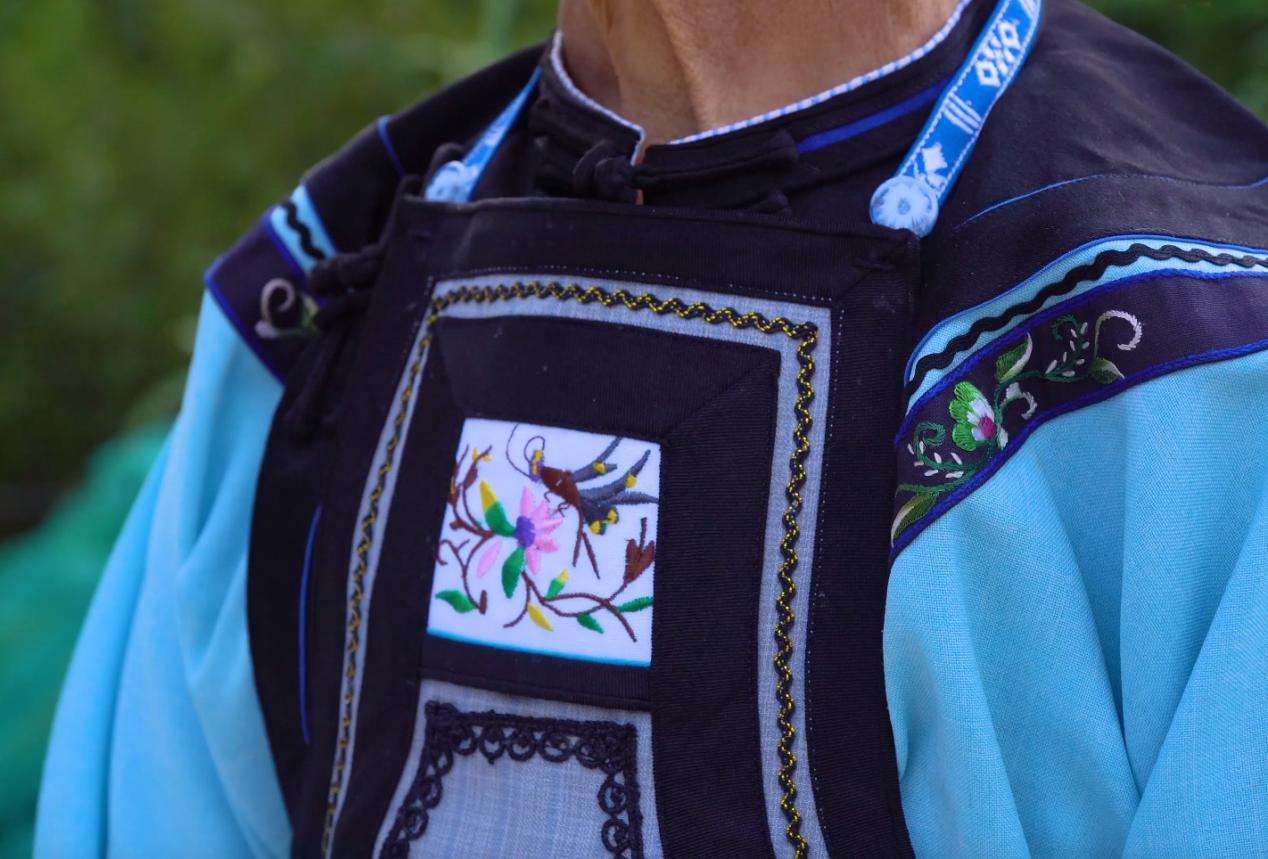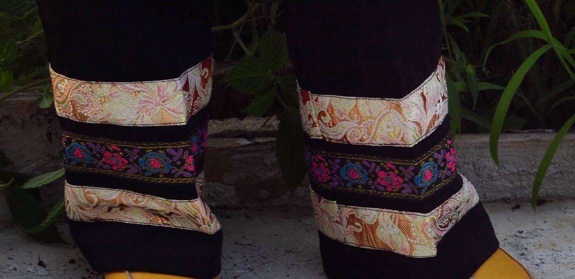 傳統(tǒng)服飾是由布依族傳統(tǒng)工藝制作而成,其上衣以藍色打底的斜襟衣和白色打底的圍腰為主,上衣對襟處繡有花草圖案作為裝飾,圍腰上部也繡有花草圖案作為描邊。下身則以黑色長褲和灰色長褲為主,衣飾上所有的雕花刺繡圖案全部出自之手。多從市場上購買。其上身對襟處和圍腰上部也繡有花紋圖案,但是這些花紋圖案則是現(xiàn)代機器之功,下身以黑色打底的長褲為主,在褲腳處繡有花草圖案,上板村布依族女性們還有一個習慣,就是不管是穿戴傳統(tǒng)服飾還是現(xiàn)代服飾都會戴有黑色圓帽。