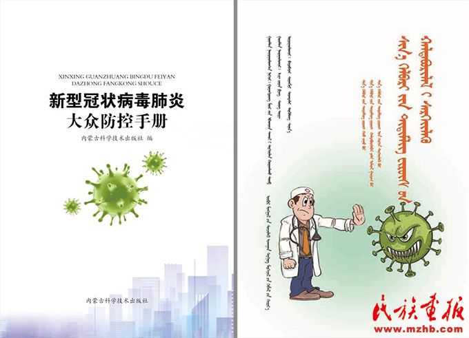 內(nèi)蒙古科學技術出版社出版的《新型冠狀病毒肺炎大眾防控手冊》(蒙古文版、電子版)。