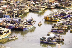 小快船靠上捕魚歸來的大漁船,收購、轉(zhuǎn)運海鮮漁獲(2014年攝)。