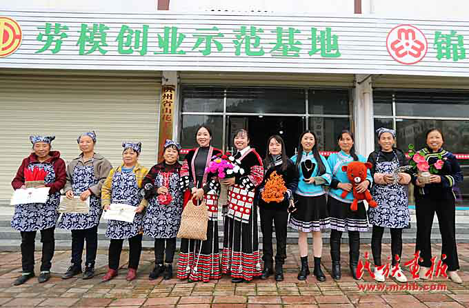 扶貧車(chē)間的姐妹們展示作品。