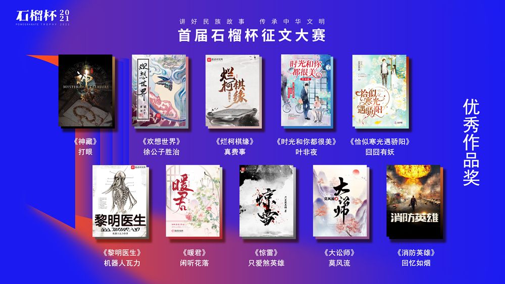 6月19日,民族題材網(wǎng)絡(luò)文學(xué)創(chuàng)作論壇暨首屆石榴杯征文大賽頒獎典禮在京舉行。作為國家民委主辦的“中華民族全家福”系列活動之一,首屆石榴杯征文大賽得到了國家民委文化宣傳司和中國少數(shù)民族文化藝術(shù)促進會的指導(dǎo)與支持,由閱文集團聯(lián)合天成嘉華文化傳媒、中國民族文化資源庫、中國民族文化資源網(wǎng)共同舉辦。本屆大賽以“講好民族故事 ,傳承中華文明”為主題,涌現(xiàn)出眾多弘揚民族精神、表達文化自信、傳播正能量的作品。經(jīng)過專家推薦及嚴(yán)格評審,《草原有座蒙古包》、《走西口之天山行》、《彩云微光》等三部作品獲“最具民族風(fēng)采獎”,《神藏》、《歡想世界》、《爛柯棋緣》、《時光和你都很美》、《恰似寒光遇驕陽》、《黎明醫(yī)生》、《暖君》、《驚雷》、《大訟師》、《消防英雄》等十部作品獲“優(yōu)秀作品獎”。所有獲獎作品都將收錄入中國民族文化資源庫。中國作家協(xié)會副主席、書記處書記吉狄馬加表示,本屆石榴杯大賽是在黨和國家長期以來堅持的對民族文化、少數(shù)民族作家創(chuàng)作和民族題材創(chuàng)作的大力扶持下,依托網(wǎng)絡(luò)文學(xué)平臺,將文學(xué)作品與影視作品改編、游戲、動漫產(chǎn)品制作結(jié)合起來,探索的一條發(fā)展民族文化的新路,具有開創(chuàng)意義。