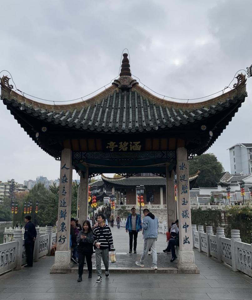 第一部分是石牌坊、浮玉橋和涵碧亭。漢白玉石牌坊上書“城南勝跡”四個(gè)大字,立柱的“抱鼓石”為八尊石獅子,石獅尾朝上頭朝下,活靈活現(xiàn),富有生氣。穿過石牌坊走上浮玉橋,橋體連接南北兩岸,其名來源于其質(zhì)地,由貴州特產(chǎn)白棉石打造,從遠(yuǎn)處看猶如一條玉帶浮在水面。橋上的涵碧亭是古人納涼休息的地方,因橋下有深潭“涵碧潭”而得名,亭子四柱上刻有兩幅對(duì)聯(lián),分別是“水從碧玉環(huán)中出,人在青蓮瓣里行”、“銀漢浮空星過水,玉虹拖雨雁橫秋”。